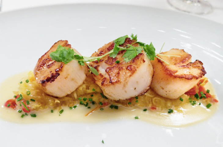 В сковороде разогреть растительное масло. Гребешки посолить и поперчить, добавить в сковороду и готовить на сильном огне, перевернув один раз, пока они не подрумянятся, по 2 минуты с каждой стороны. Выложить гребешки и шпинат на тарелку. Украсить кедровыми орешками. Слегка разогреть соус, полить ложкой соуса гребешки и подавать.
