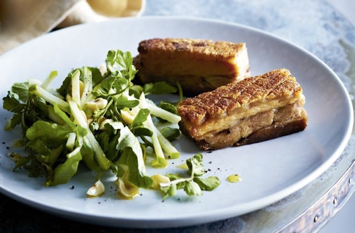 Перед подачей свинину необходимо положить кожей вниз на застеленный пергаментной бумагой противень. Сверху накрыть бумагой, поставить другой противень и какой-нибудь груз. В таком виде свинину необходимо поставить в холодильник на ночь.