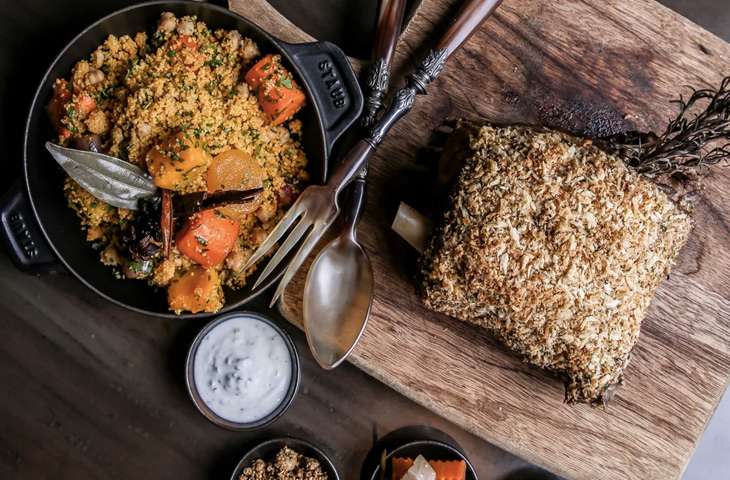 Достать мясо из духовки и дать ему остыть в масле до такой температуры, чтобы с ним можно было работать. Покрыть мясо панировкой из трав и хлебных крошек и запекать еще около 10-15 минут при 190 °C. Перед подачей дать мясу отдохнуть.