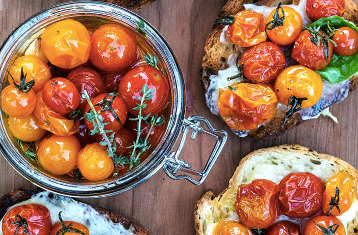 Запекать в течение 40-50 минут, пока помидоры не станут мягкими и не сморщатся. Дать остыть, после чего разложить по банкам и залить оливковым маслом. Хранить в холодильнике до использования.