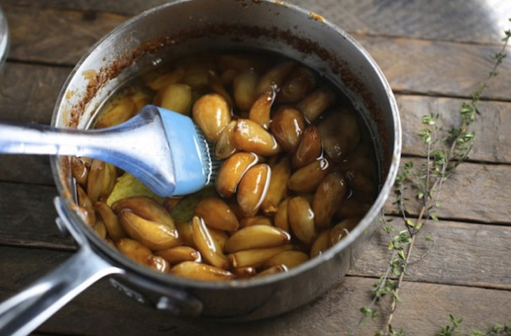 Разогреть духовку до 220 градусов. Поставить решетку в нижнюю часть. Нагреть сливочное и оливковое масло в небольшой кастрюле на средне-низком огне до 104 градусов. Убавить огонь до минимума, выложить в кастрюлю веточки тимьяна и чеснок. Готовить, время от времени помешивая, до тех пор, пока чеснок не станет мягким и не окрасится в золотисто-коричневый цвет, 20 -25 минут. Спустя 15 минут с начала приготовления достать тимьян. В процессе приготовления температура масла должна быть ниже 125 градусов, иначе оно может начать гореть. Перед подачей дать чесноку остыть.