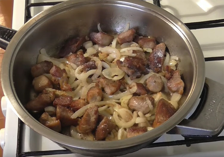 Свинину нарезаем небольшими кусками и предварительно промыв кидаем на политую растительным маслом раскаленную сковороду. Особенностью свинины является первичное прилипание к сковороде, но как только образуется корочка - проблема прилипания отпадает. Поэтому первые минуты жарки особенно важны.