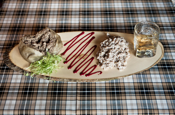 В «Шотландской клетке» Хаггис подается с перловым ризотто. И, конечно, Хаггис невозможен без бокала шотландского виски — dram, что на сленге означает «глоток».
