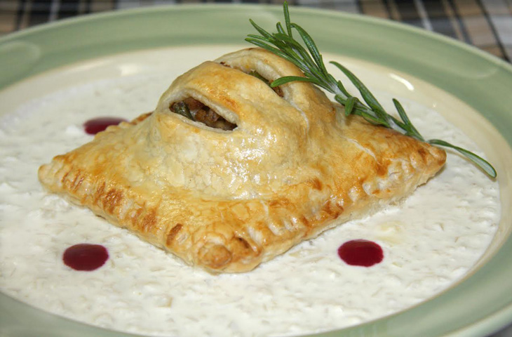 Розмарин - 1 веточкаСпособ приготовления: Слоеное тесто нарезать на квадраты. Готовый фарш (прокручиваем мясо кабана в мясорубке) уложить в центр квадрата, сверху выложить перловую крупу, мелко нарезанные помидоры и стручковую фасоль. Аккуратно закрыть другим квадратом теста. Края пирога защипать. Пирог смазать яйцом и выпекать в духовке при тмпературе 180 ºC в течение 12 минут. На готовое блюдо выливаем соус из белого вина и выкладываем готовый пирог. При подаче украшаем капельками брусничного соуса и веточкой розмарина.