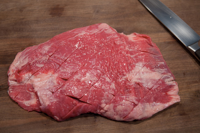 Фланк стейки нарезают только поперек волокон. Это позволяет сделать жесткую структуру фланка более нежной. Кроме того, так мясо будет легче жевать. Перед тем как приступить к нарезке стейка, дайте мясу отдохнуть 5-10 минут на доске, прикрыв его фольгой.