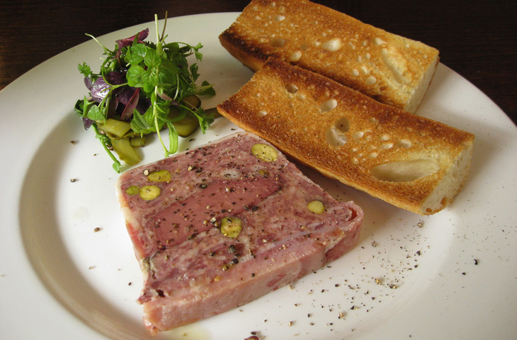 Способов придания формы также не счесть — здесь вам запекание и в тесте (en croûte), и в пресс-форме (en terrine), и даже в коже (galantines и ballottines). В качестве ориентировки опишем портрет типичного pâté de campagne: аппетитная буханка из мяса и субпродуктов, приправленная луком, белым перцем и коньяком; по консистенции очень легкая и нежная на вкус.