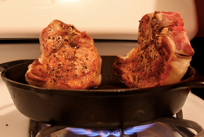 Как бы вам ни хотелось включить конфорку на полную мощность, подобные фантазии лучше приберечь для другого блюда. Высокий огонь в течение всего процесса приготовления не позволит получить равномерно прожаренную отбивную. Идеальная для свиной отбивной схема: большой огонь в самом начале, затем средний. Высокое пламя создаст на отбивной корочку, а среднее тепло поможет не пересушить мясо снаружи и одновременно довести мясо до оптимальной температуры внутри.