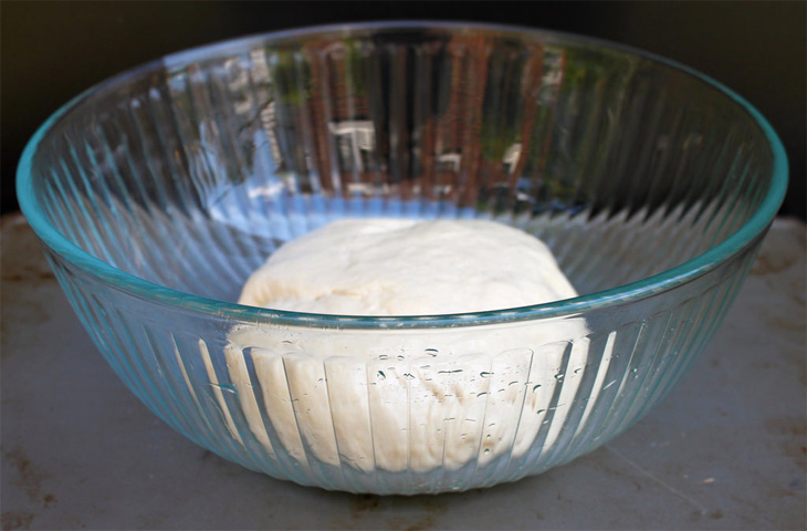Среднюю миску смазать маслом и выложить в нее тесто. Накрыть миску кухонным полотенцем и убрать в теплое место примерно на 1 час, чтобы тесто поднялось примерно в два раза.