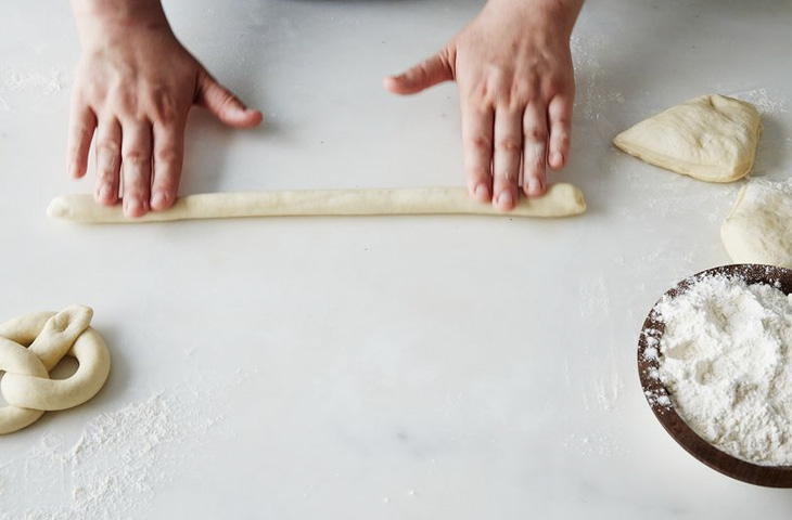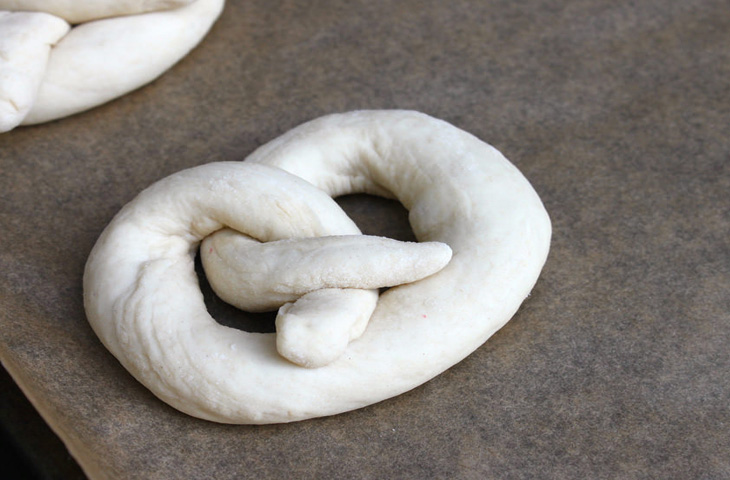 Когда тесто поднимется, выложить его на чистую, посыпанную мукой поверхность и разделите на 8 до 10 равных частей, размером с мяч для гольфа. Скатать тонкие, длинные колбаски. Придать колбаскам U-образную форму, а затем загнуть два конца внутрь и переплести их между собой в нижней части кренделя.