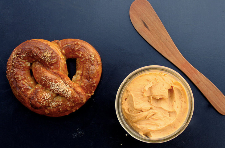 Переложить сырный соус в небольшую миску. Выложить крендели на тарелку и подавать вместе с соусом.