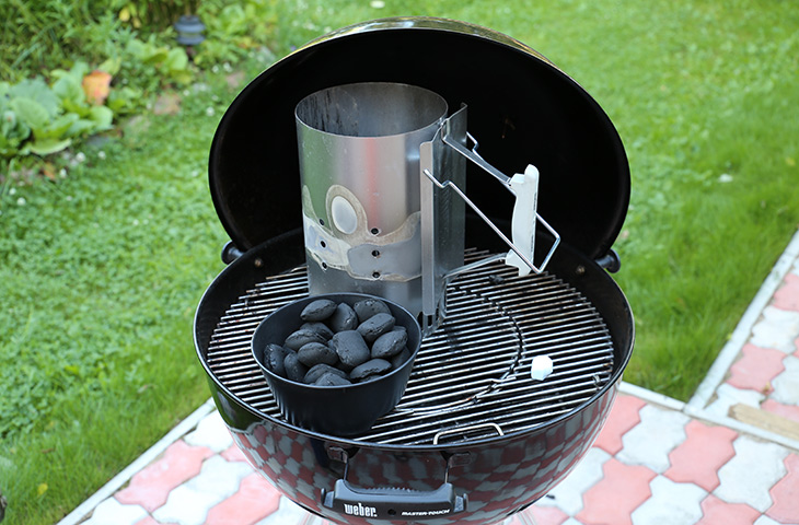 Для этого рецепта вполне достаточно одной чашки угля. Высыпаем его в так называемый «стартер». Ставим «стартер» на решетку гриля и поджигаем специальную восковую таблетку под ним.