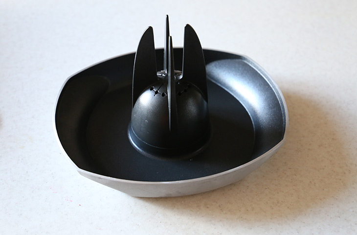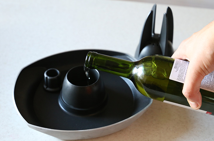 Далее наливаем вино уже в специальную чашку в ростер для курицы. Сверху ставится вот такая остроконечная вторая половина этого кулинарного устройства. На нее и «надевается» курица.