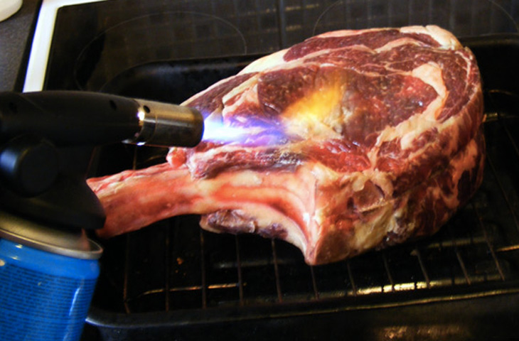 Хестон Блюменталь известный любитель разрушать устоявшиеся кулинарные стереотипы и полностью переосмысливать рецепты. Было бы удивительно, если бы он не попробовал переписать технологию приготовления такого классического блюда, как стейк. На этот раз шеф решил не прибегать к помощи жидкого азота и центрифуг, а обойтись обычной духовкой и мощной кулинарной горелкой. Готовится такой стейк до неприличия долго, но, говорят, получается фантастически вкусно. Кухонный алхимик берет увесистый рибай на кости хорошенько проходится по нему горелкой, чтобы убить все бактерии и покрыть его румяной корочкой, а затем ставит в разогретую до 50 °C и оставляет томиться на 24 часа. Спустя сутки он достает мясо из духовки, накрывает фольгой и забывает про него еще на 2-4 часа. Потом он нарезает рибай на стейки и обжаривает на раскаленной сковороде по 4 минуты с каждой стороны, переворачивая их каждые 15-20 секунд.
