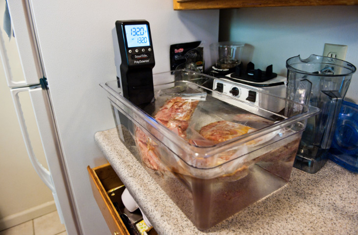Это более простой и, что немаловажно, более быстрый способ низкотемпературного приготовления. Никаких суровых испытаний соблазнами с духовкой и горелок! Потребуется герметичная емкость с термостатом, ну или, на худой конец, кастрюля, термометр и кипятильник, для более бюджетный версии. Приготовление стейка происходит в вакууме при низких температурах, что в ста процентах случаев гарантирует превосходный результат. Запечатанный в пакете стейк опускается в воду, в которой постоянно поддерживается заданная температура. В зависимости от желаемой прожарки и отруба готовится стейк в сувиде от 1 до 3-х часов.