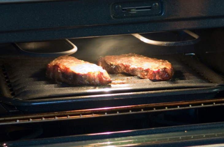 В верхней части современных духовок располагается нагревательный элемент, напоминающий ТЭН чайника. Эта штуковина называется грилем или пугающим многих словом «бройлер». Он направляет тепло непосредственно на мясо (или любой другой продукт), за счет чего минуя все стадии подготовки барбекю, можно пожарить стейк с эффектом гриля. Решетку в духовке размещают так, чтобы стейк располагался примерно в 10-12 см. от гриля. Затем включают гриль и дают ему нагреться. Сам стейк кладут на проволочную подставку или решетку, расположенную на застеленном фольгой противне. Вся эта нехитрая конструкция вместе со стейком отправляется в духовку. Во время приготовления переворачивается мясо один раз. Запекается стейк до желаемой прожарки, ну а потом, по традиции, оставляется полежать на доске еще 5-10 минут.