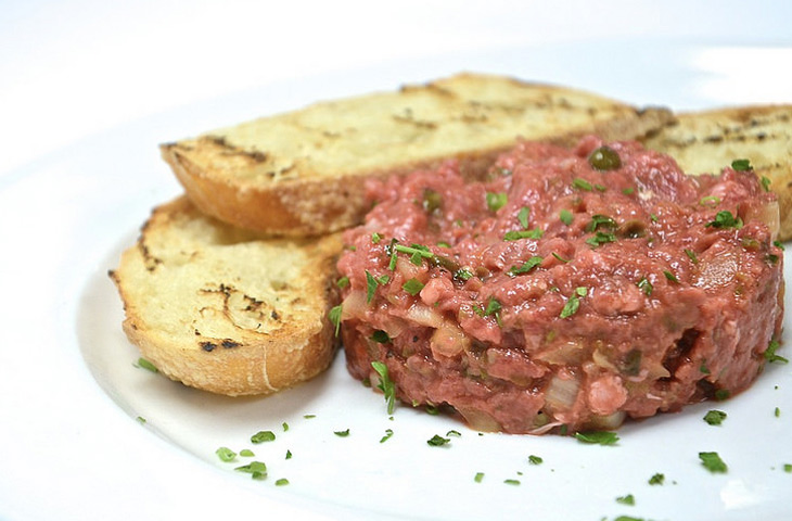 Несмотря на то, что по большому счету это все лишь горка свежего мяса без какой-либо термической обработки, этот способ подачи стейка считается самым сложным. К этому минималистичному блюду предъявляются самые жесткие требования: мясо должно быть свежайшим и самого высокого качества. Мясо нарезается маленькими кубиками и выкладывается в центр тарелки. Вокруг него размещаются все дополнительные ингредиенты: зелень, корнишоны, каперсы, рубленый лук, горчица и вустерский соус. Дальше вы сами можете выбрать составляющие блюда и смешать их по своему вкусу.