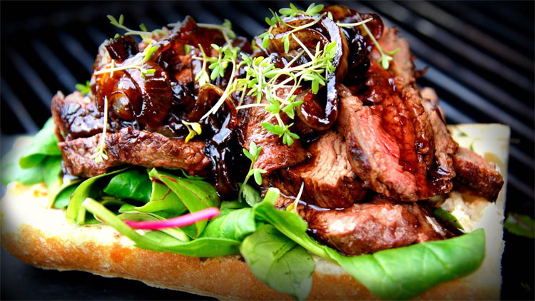 Разогреть сковороду-гриль. Смазать кусочки мяса маслом; приправить солью и перцем. Обжарить мясо партиями, перевернув один раз, до прожарки medium rare. Окунуть мясо в грибной соус и выложить на багет. Сверху полить ложкой соуса, закрыть сэндвич второй половинкой багета и подавать.