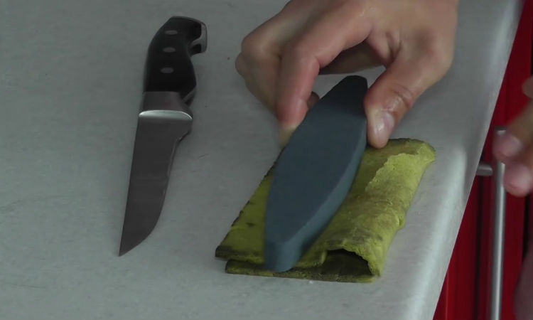 Работа ведется самым обычным бруском. Зернистость — P-150. Вообще, чем меньше зерно, тем острее будет заточка. В данном случае мастер обходится одним бруском, но можно взять и два: сначала поточить на среднем зерне, потом сменить на брусок с более мелким.