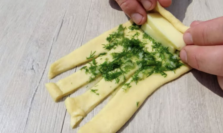 Заготовки раскатываются и смазываются чесночным маслом. Зелени жалеть не нужно. По краям расположим брусочки сыра и уже потом формируем саму булочку.