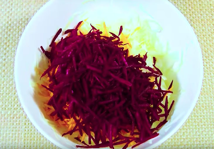 Основные составляющие очень просты: капуста, морковь, свекла, луковица. Для заправки потребуется лимонный сок и растительное или оливковое масло.