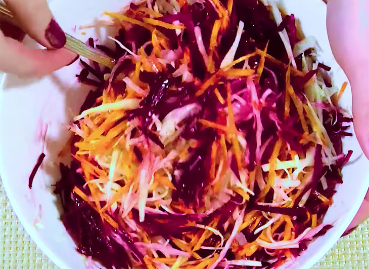 Мелко нарезаем основные ингредиенты и смешиваем в посуде. Для того, чтобы свекла не красила остальные овощи, мы ее добавим последней. Смешивать с овощами мы ее не будем, а положим в отдельную емкость и добавим как раз в нее масла.