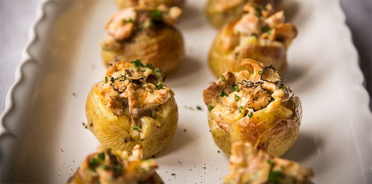 - разрезаем картофель вдоль, вынуть частично мякоть. Приправить солью и начинить грибным рагу.