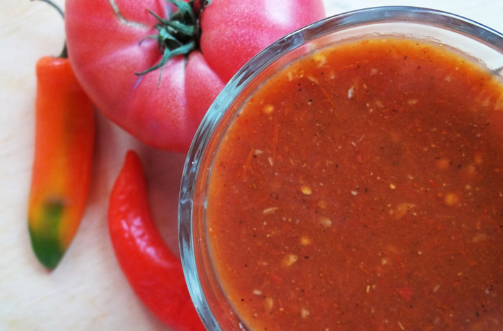 1 ст. ложка растительного масла.Залить сливы водой в большой эмалированной кастрюле . Она должна их покрывать, после чего ставьте на огонь. Довести приготовленную массу до кипения. Затем необходимо убавить огонь до слабого, закрыть крышкой и варить до мягкости (10—15 минут). Затем воду слить. Вынуть из слив косточки и протереть через частое сито. Положить сливы обратно в кастрюлю, добавить кинзу, чеснок, кориандр, красный перец, лимонный сок и соль. Довести приготовленную смесь до кипения. Подержать на огне 2—3 минуты. Снять с огня. Затем остудить соус до комнатной температуры и отправить в холодильник. Через 5—7 часов соус будет готов к употреблению. Он может храниться в холодильнике в течение 2 месяцев.