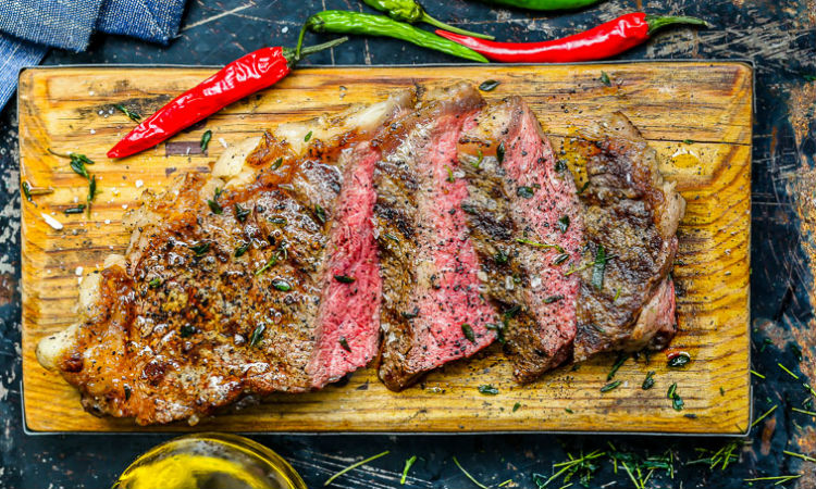 Стейк жарится около 50 секунд с каждой стороны. Затем жар убавляется до среднего и мясо готовится еще по 2 минуты с каждой стороны. Средняя прожарка оптимальна: хрустящая корочка снаружи и нежная, ароматная мякоть внутри.