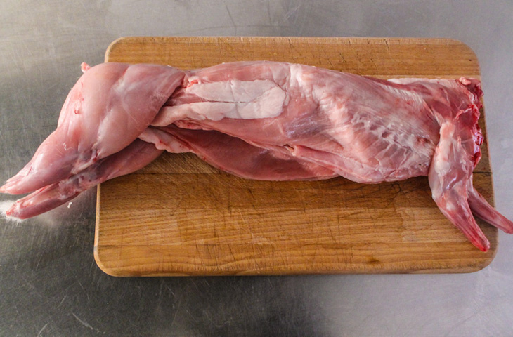 Выбирая кролика для рулета обратите внимание на размер: он должным быть средним, в идеале большим. Я взял среднего, весом 2 кг. Первым делом, если это необходимо, очищаем его от внутренностей, отрезаем голову. Но, как правило, в магазинах тушку продают уже без всех этих «лишних частей».