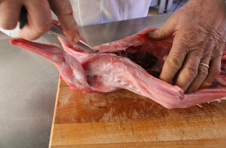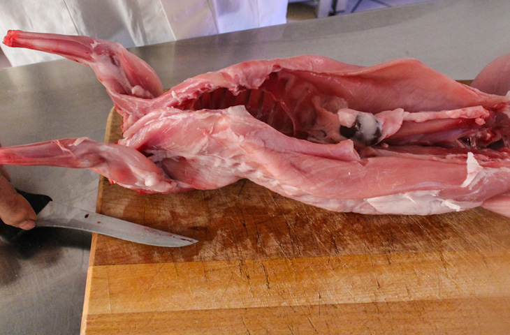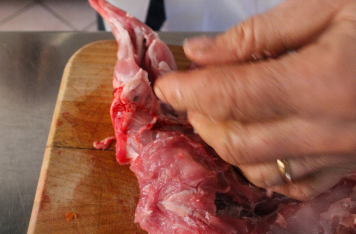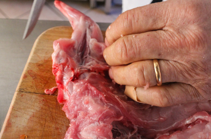 Зная об этом, мясники делают заготовки под блюда: обрабатывают и подготавливают мясо. Не будь этих полуфабрикатов, некоторые традиционные блюда итальянской кухни можно было бы найти только в ресторане. В их число, без сомнения, попал бы рулет из кролика. Фраза «отделите цельную тушку кролика от костей» была одной из самых частых просьб, которые мне доводилось слышать от клиентов. И дело не в том, что в моей лавке не было этого полуфабриката. Просто частенько он заканчивался с такой скоростью, что я не успевал заранее подготовить новый. На самом деле удалить из кролика кости, сохранив цельным мясо, не так уж и сложно. Главное, знать с чего начать и соблюдать правильную последовательность разделки.