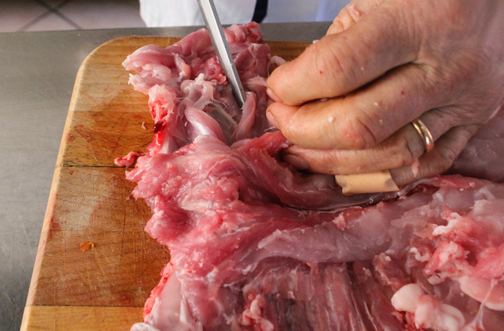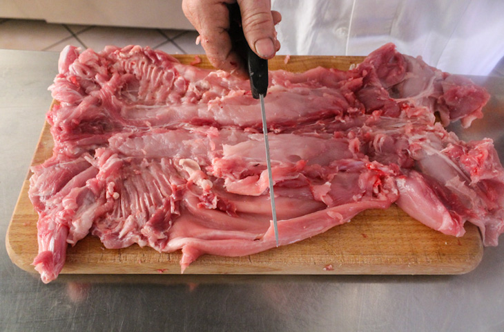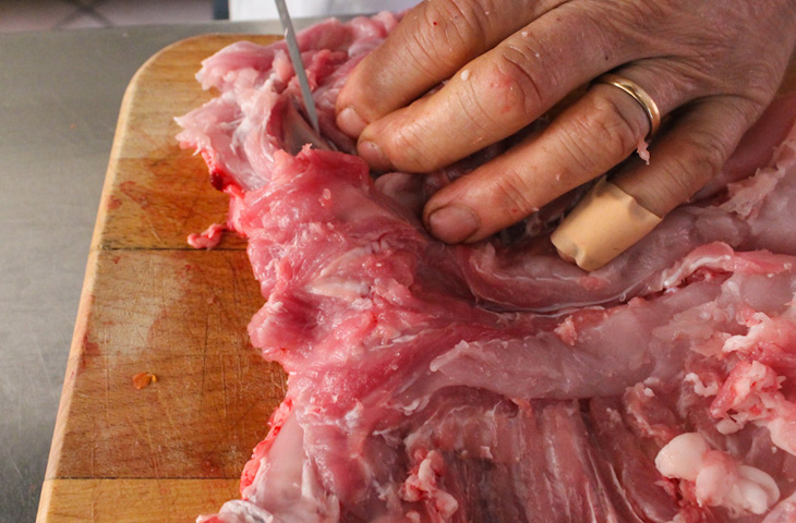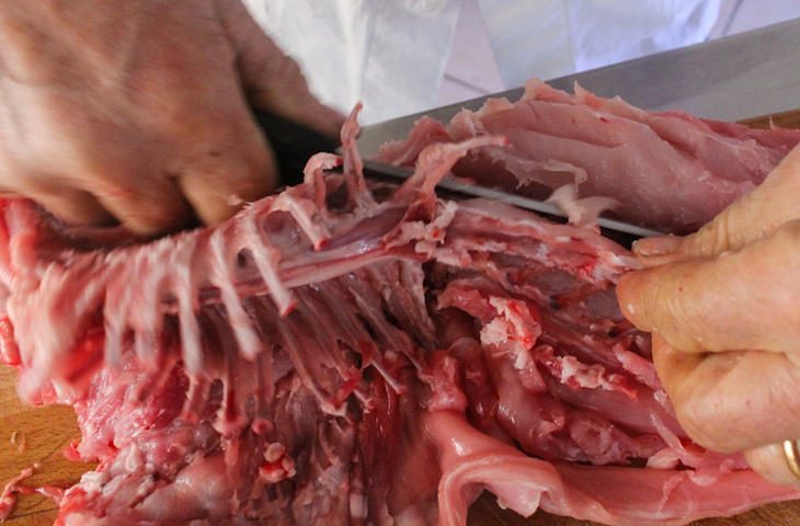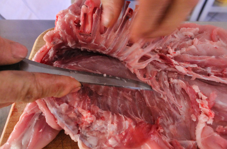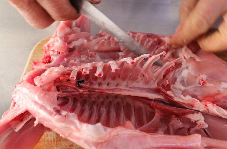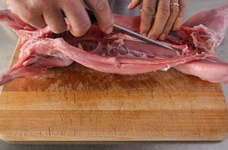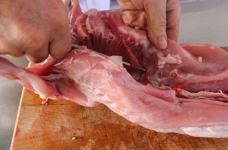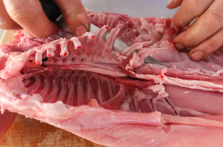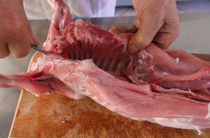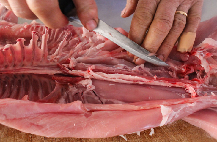 Если вначале качественно отделить позвонки от мяса, то в конце разделки позвоночник можно будет отделить практически без помощи ножа.