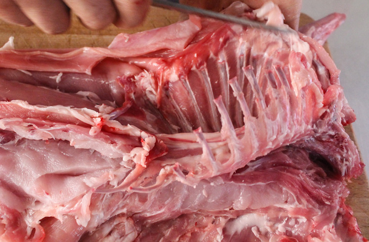 Освободив ребра от пленок, потихоньку начинаем отделять их от мяса. Тушку слегка оттягиваем на себя и как бы «выдавливаем» большим пальцем ребра. Если на ребрах не осталось пленок, край костей достаточно легко будет отходить от мяса.