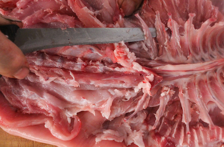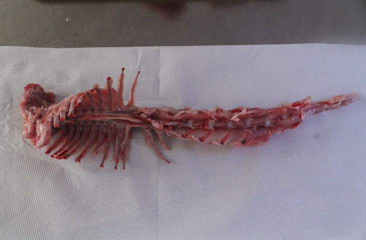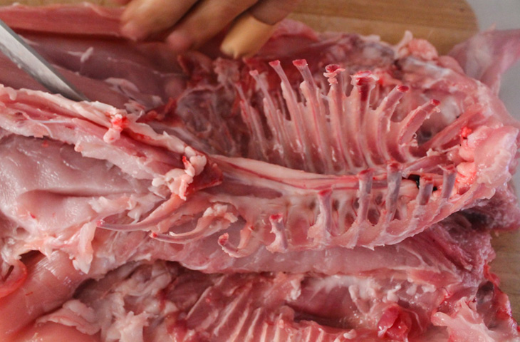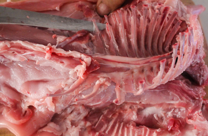 Приступаем к новому этапу — непосредственно отделению всех отделов позвоночника от тушки. Когда вы дойдете до этой части, убедитесь, что все позвонки и реберные кости отделены от мяса. Важно: отделять позвоночник следует от головы к хвосту, ни в коем случае не наоборот. Одной рукой берем ребра, другой отделяем позвоночник от мяса.