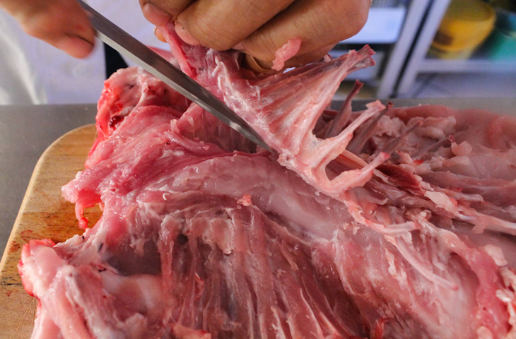 Дальше для отделения костей начинаем задействовать нож. Заводим его за оголенные концы ребер и плавно режем мясо вдоль костей. Второй рукой оттягиваем тушку.