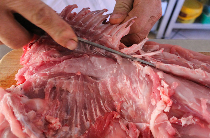 Слегка оттягиваем одной рукой позвоночник, другой продолжаем отделять его от мяса.