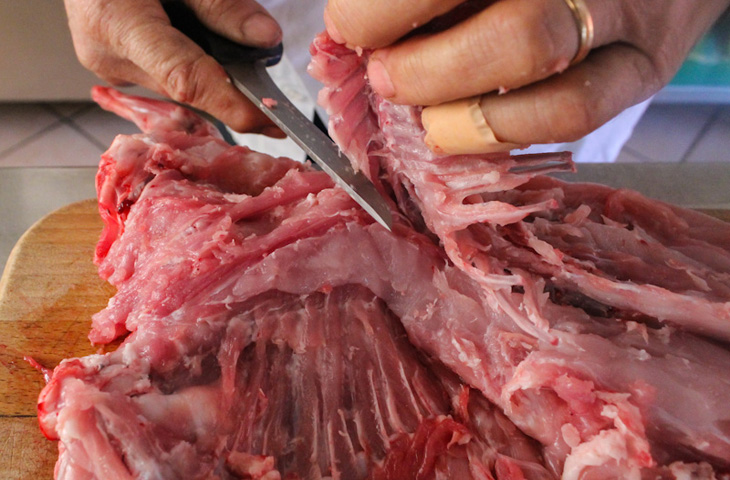 Переходим непосредственно к извлечению костей. Начинаем с ребер. Зачищаем на них пленку: просто скоблим по поверхности ребер ножом.