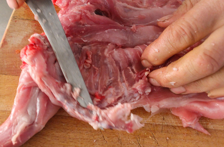 В моем кролике часть внутренностей все же была. Чтобы извлечь их, я разрезал по центру грудную клетку.