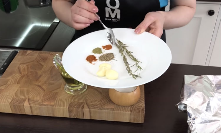 Заправку из специй, чеснока и растительного масла готовим заранее. Ей нужно дать настояться минут 15. Затем польем картошку и завернем в фольгу.