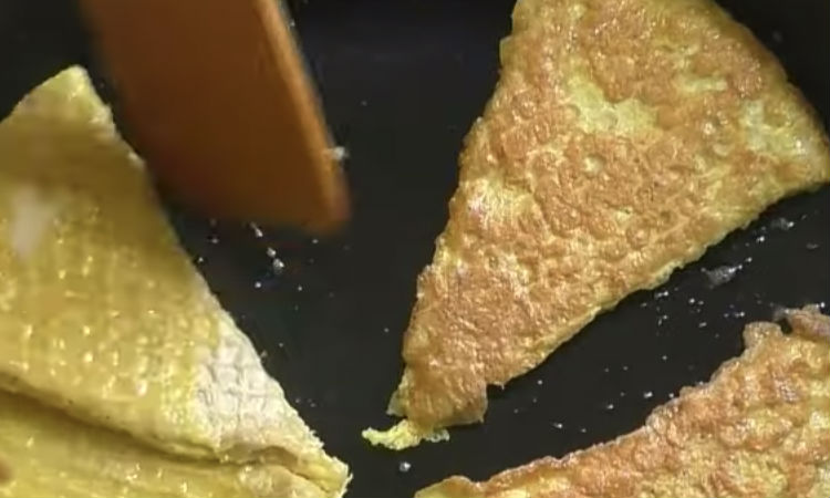 Как раз есть время взбить яйца венчиком. Разрезаем корж на сравнительно небольшие кусочки, обмакиваем каждый в яйцо и кладем на разогретую сковороду.