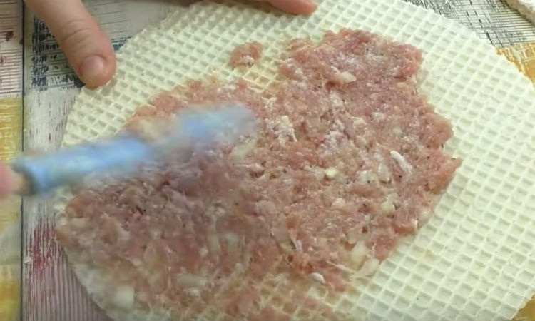 На вафельные коржи нанесем очень тонкий слой фарша. Коржи ведь тоже достаточно тонки, поэтому мясо вполне успеет хорошо прожариться. Накрываем сверху вторым коржом, даем еще минут 10 настоятся, чтобы потом готовые вафли резались легко и не ломались.