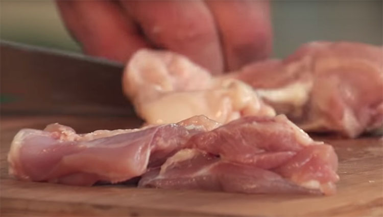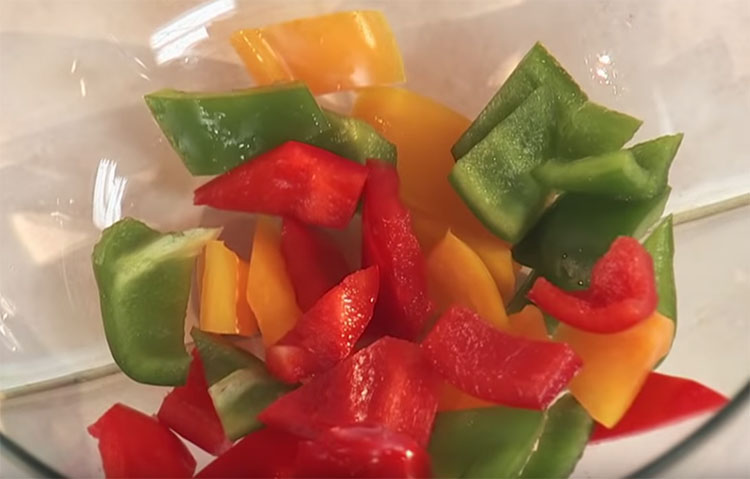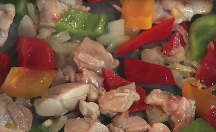 Сначала мы подготавливаем нашу начинку. Нарезаем овощи, лук и немного курицы. Ее можно заменить ветчиной или колбасками.