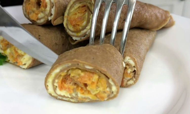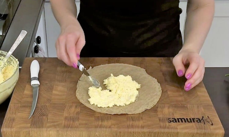 Обжариваем всю начинку, а сваренные вкрутую яйца натираем на крупной терке. Перемешиваем и пора уже крутить трубочки. Аккуратно выкладываем всю массу, распределяем по основе и сворачиваем.