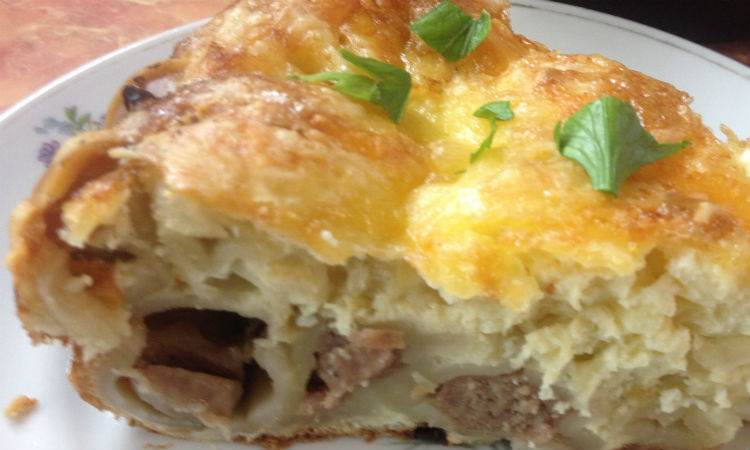 Порежем и насыпем прямо на макароны ветчину. Кстати, можно вместо ветчины использовать и любой фарш. Чеснок будет не лишним, придаст необходимый аромат. И теперь заливаем яичной смесью. Сверху трем сыр, чтобы было еще вкуснее. Заворачиваем всю форму фольгой и в духовку, на полчаса при 180 градусах.