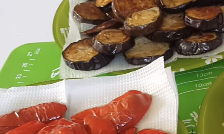 Красный перец делим на 4 части, обжариваем вместе с баклажанами на сковороде. Затем шинкуем чеснок, укроп и кинзу, чем мельче тем лучше. Оставляем пока в стороне, займемся помидорами. Килограмм режем кольцами и начинаем заполнять банку слоями: слой помидоров, затем баклажаны, красный перец, зелень.