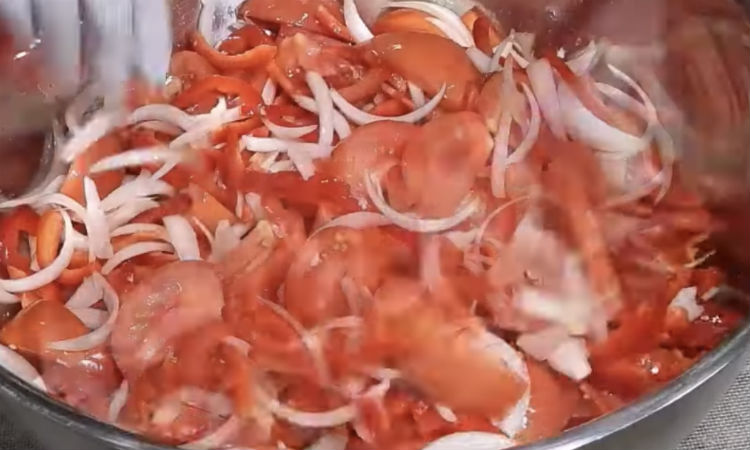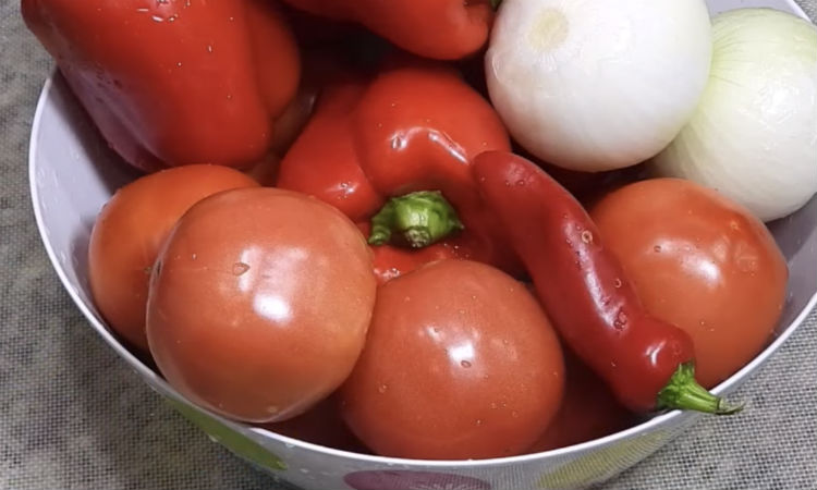 Возьмем за основу сразу 2 килограмма помидоров, 1 килограмм красного болгарского перца. Половину килограмма репчатого лука, 4 зубчика чеснока, острый красный перец (тут по количеству надо рассчитывать кто как любит), соль и сахар. Кроме того, в каждую банку пойдет еще лавровый лист, перец горошком, семена кориандра, столовая ложка 9% уксуса.
