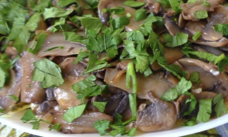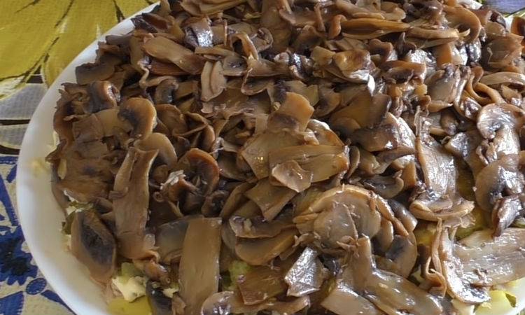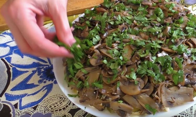 Грибы режем на пластинки и обжариваем на сковороде с растительным маслом до золотистого цвета. Они станут последним слоем: укладываем грибы и отправляем салат настоятся в холодильник, на два-три часа. Перед подачей украшаем зеленью.