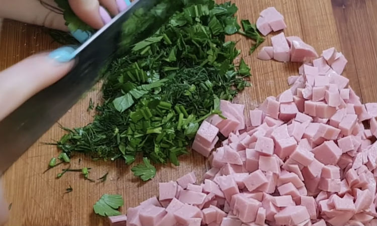 Мелко шинкуем зелень, всыпаем ее сверху. Добавляем любимые специи, яйца, все перемешиваем, добавляем начинку и муку.