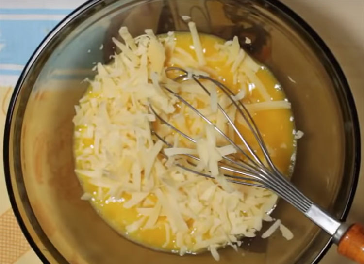 Мы приготовим самую простую версию этого блюда – с сыром. Но в дополнение к сыру можно класть любую начинку: ветчину, фарш, овощи или сосиски. В миску разбиваем 3 яйца и натираем сыр – теперь нужно все хорошенько перемешать.