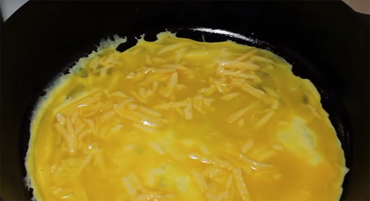 Выливаем содержимое миски на сковороду и ждем, когда низ начнет схватываться. Омлет можно сворачивать в рулет. На этом этапе можно добавлять любую начинку - потом это будет сделать уже невозможно.