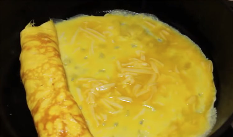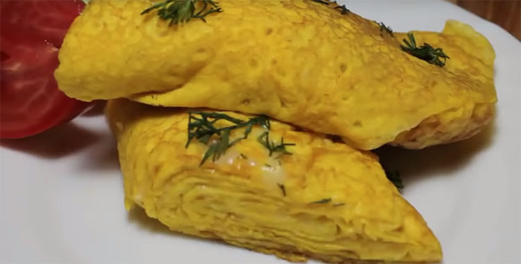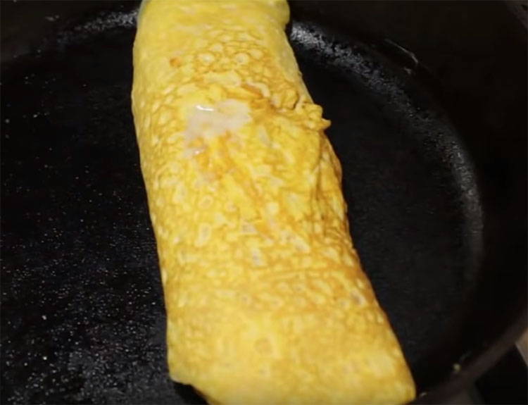 Сочность омлета можно регулировать – если начать сворачивать омлет почти сразу, внутренности рулета будут самыми сочными.